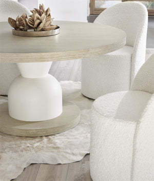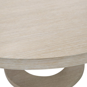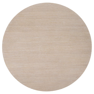 Round dining table.Quartered ash solids and quartered oak veneer in Dune finish on table top.Cast pedestal in faux stone Fossil finish with quartered oak veneered base in Dune finishAdjustable glides