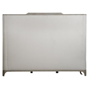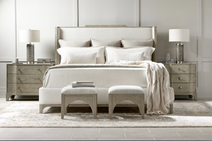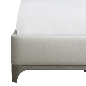 White oak solids and knotty white oak veneersWood-framed upholstered shelter headboard with wood baseUpholstered footboard and side rails with wood baseAll exposed wood in Pewter finishStandard with five wood slats with adjustable center support