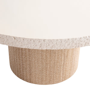 Cast resin top in faux stone Crema finishSmooth top and chiseled edgeRound base wrapped in twisted ropeSandbar finishSmall recessed plinth base