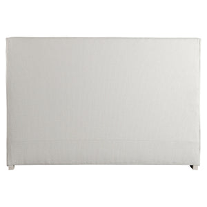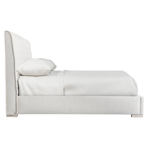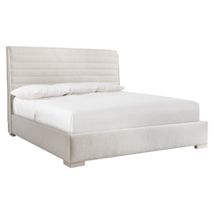 Upholstered headboard, side rails and footboard with exposed wood feet in Lutra finishHeadboard has horizontal channels and flangeAvailable in fabric B114Standard with five wood slats with adjustable center supportSpecifications subject to change without notice