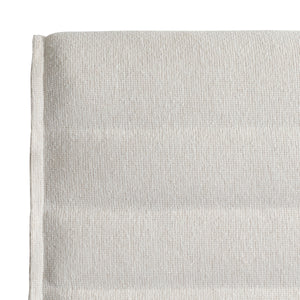 Upholstered headboard, side rails and footboard with exposed wood feet in Lutra finishHeadboard has horizontal channels and flangeAvailable in fabric B114Standard with five wood slats with adjustable center supportSpecifications subject to change without notice
