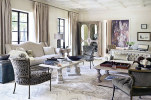 Bernhardt Interiors offers high-design furniture with an eclectic edge. With its sweeping geometric form, the Cohen chair brings a sophisticated modern look to an interior. A deeply textured black iron frame adds an industrial edge, while clean lines and angles keep the piece spare and modern. To accomodate any style, the upholstered seat and half-back are available in a variety of fine fabrics.