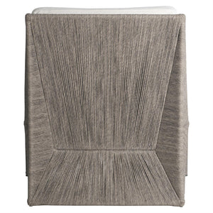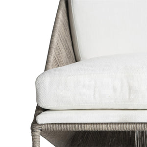 Metal frame wrapped in All-Weather wicker in Egret Grey finishExteriors Plush seat cushionKnife-edge fiber back pillow with topstitchComes standard with (1) 11"x21" box-edge, welted kidney pillowOutdoor performance fabricExterior grade materials