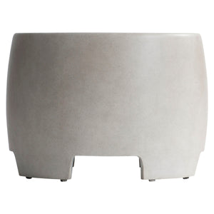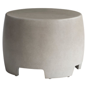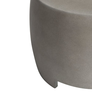 Cast glass-reinforced concrete (GRC) round cocktail table.Smooth top.Bedrock finish.Stainless steel adjustable glides and inserts.